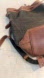 LAND, GENUINE Leather Black & Brown large bucket Drawstring Bag/Purse. Adjustable leather strap. Inside lining in excellent condition. Outside has a large pocket for storage. Bag/purse has wear,but lots of life left in it. Great DURABLE Bag. Button has a small hole, see photo. Inside one pocket that has zipper closure. Purse has signs of wear but ads to its charm. See photos