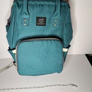 Spacious and stylish LAND Mommy & Baby diaper backpack in teal. Unused (no tags) and in excellent condition. Features multiple compartments, gold-tone zippers, and padded straps. Perfect for organizing baby essentials on the go. No changing pad included.