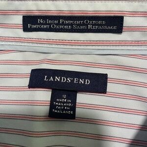Excellent used condition Ladies Lands End no iron pinpoint Oxford shirt. Light blue with pinkish/red stripe detail.