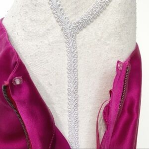 LANVIN 100% SILK FUCHSIA PINK ONE SLEEVE DRAPED ZIPPER UP BELTED COCKTAIL FORMAL DRESS, a couture high quality LANVIN summer 2013 edition solid fuchsia draped dress featuring - one sleeve gathered on the shoulder's top with extra fabric detail on it, draped dress - one elastic large clipping belt with a security clip inside - one exposed full length zipper on the side (with one button on top just under the armpit for safety and keeps it in place while moving). Not stretch. Cocktail, formal dress, perfect for wedding, gala, ceremony, prom, anniversary, special events.Conservative length. Rare. Unique. Designer. Couture. Classy, classic, elegant, chic, minimalist yet colorful, vibrant, vivid, feminine, sexy, perfect for spring and summer formal events, valentine's day date, holiday partys and more.
