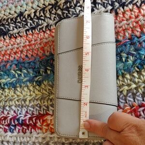 - gray/stone colour, logo on front of wallet, large zip around wallet, silver tone hardware