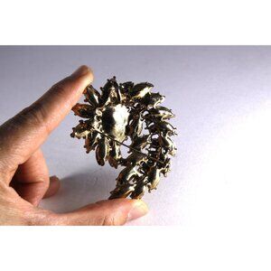 A large breathtakingly dazzling brooch, which can also be worn as a pendant, in satisfyingly mellowed tones of amber honey, champagne yellow and white / purple aurora borealis rhinestones. It is a gorgeous size for a true statement piece. Unsigned, the closest design I have been able to find is by Cara New York.