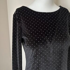 Dynamite velvet and silver studs dress, size small. Wide neckline at front and V-neck at back. Long sleeve. Unlined. 92% polyester, 8% spandex.