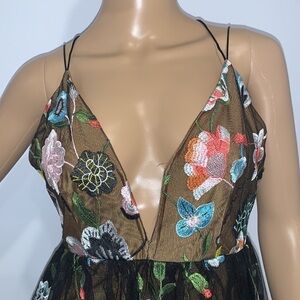 L’ATISTE Black Flower Embroidered Sundress Backless Deep V- neckline Special event Maxi Dress size Small