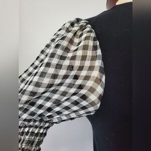 Never worn, new black top. Soft cotton tshirt V neck with checkered sheer puffed sleeves. size xs.