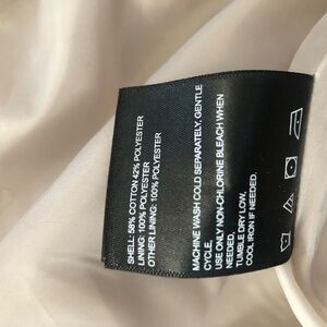 Double breasted, size small 3/4 length trench coat. Rests a couple of inches above the knee. Beautiful gold buttons. Colour is very light (greige maybe ivory)