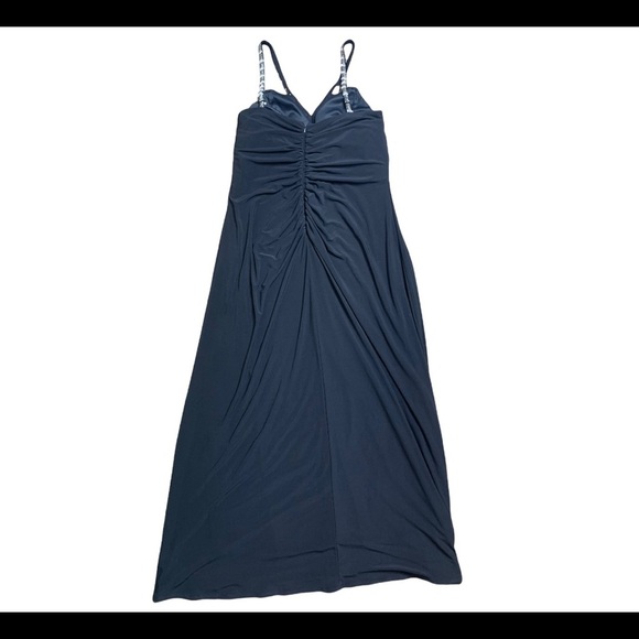 Black, Silver Beaded trim around bust area and straps, Back Zipper Detail, Ruched Detailing, Padded Bust, Lined, Plunging Neckline