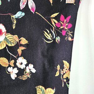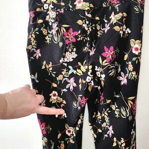 These are a beautiful pair of pull-on pants from Laura Plus in a size 2X. The black pants feature a lovely floral print with pink, yellow, and white flowers and green and gold leaves. The fabric is a comfortable and stretchy blend of 68% rayon, 28% nylon, and 4% spandex. These pants were made in Canada.