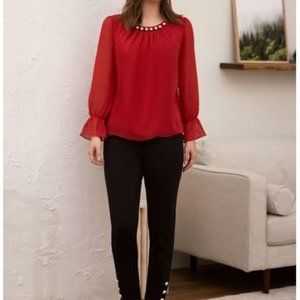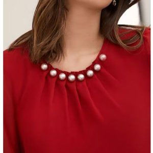 LAURA (petites): Pearl Detail Smocked Sleeve Blouse - ruby red