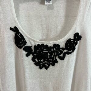 • Scoop neckline with elegant black floral appliqué