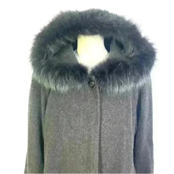 Lauren Meren wool trench coat, gray wool coat with fur hoodie, size small trench coat, preloved Lauren Meren coat, virgin wool trench coat, fur-trimmed hoodie coat, chic gray trench coat, timeless wool winter coat.
