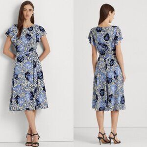 LAUREN RALPH LAUREN Blue Floral Pattern Belted Crepe Dress Womens 14 Old Money