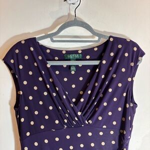 LAUREN RALPH LAUREN Sz 10 Purple Beige Polka Dot Above the Knee Ruched Dress. Light shoulder pads. Jersey knit. Classic yet trendy.