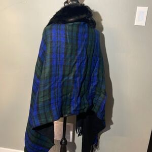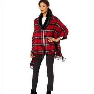 Description: Bundle up in style with this LAUREN Ralph Lauren Holiday Faux Fur Collar Wrap. It features a flattering design and a sweater-knit fabrication with an allover plaid print. Midweight cape with a faux-fur collar and open front. Fringe detail at front of hemline. 100% acrylic.