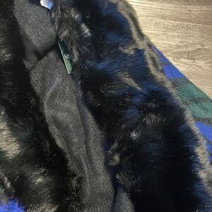 LAUREN Ralph Lauren Holiday Faux Fur Collar Wrap (Black/Blue Plaid)