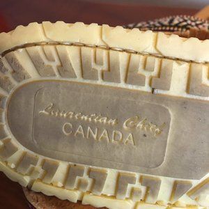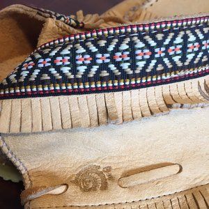 Laurentian Chief Leather Moccasin Flat Boots, Lightweight Size 10, Color Tan, Handmade from Soft and Durable Genuine Moose Hide Leather, Top Small Embroidered Patchwork, Closure Rawhide Leather Laces, left side has Two Scatches but it is in Good Condition, Worn Twice, Made in Canada, Comfortable Fringed Ankle Boots, Great Look, Great Fitting.