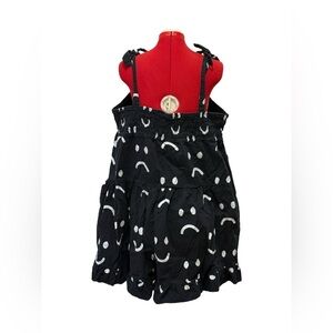 In the signature happy sad print, this is a relaxed and loose fit romper, with a tiered body and a ruffled hem, plus adjustable tie shoulders, which means you can change the fit to what's comfortable for you.