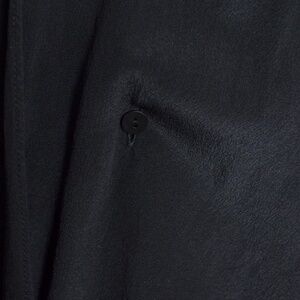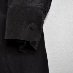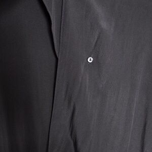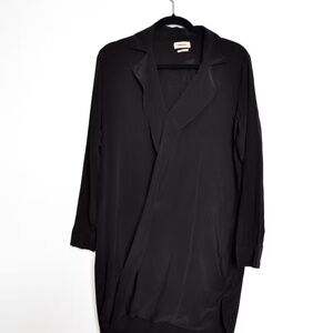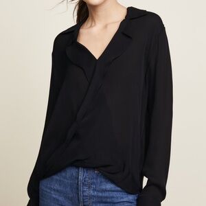 Notched lapels frame the crossover V neckline on this draped blouse. The elegant silhouette is styled with a fold-over collar and an uneven bubble hem. Long sleeves and button cuffs. 100% silk