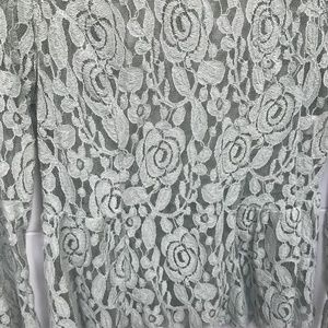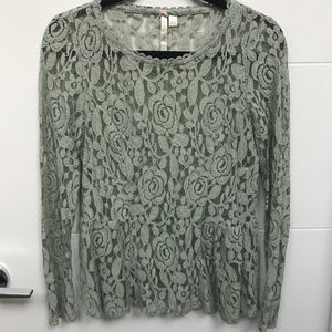 LC Lauren Conrad Runway Collection Lace Long-Sleeved Peplum Top in a Pale Mint-Green. Beautiful detail. Sheer - a tank or cami would need to be worn underneath.