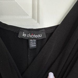 Excellent condition Le Chateau black dress. The perfect little black dress for any wardrobe. Beautiful jewel details on the straps with a handkerchief hemline. Excellent for spring/summer parties and events.