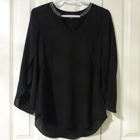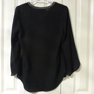 In excellent condition! Flutter sleeves, v-neck, silver shimmery beads at the neckline. Very pretty top for your next party, cocktail party, semi-formal event, date night, or night out!