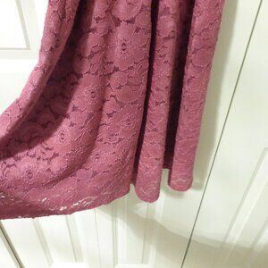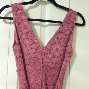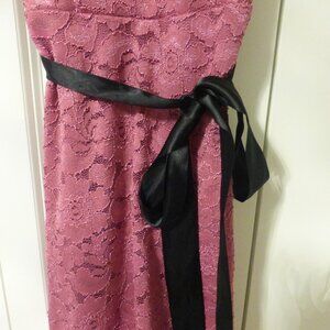In very good condition! Only worn a couple times! Very pretty pink lace dress with removable black satin belt, midi length dress. Zips up in the back. Perfect dress for your next semi-formal event, wedding, brunch date or night out!
