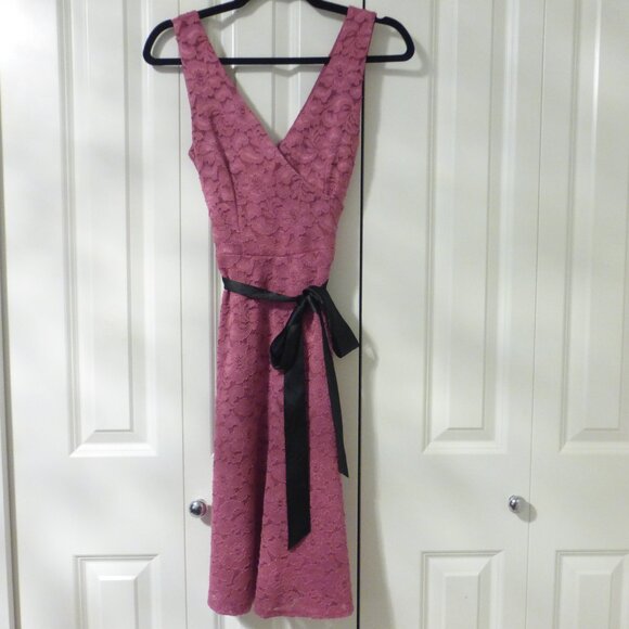In very good condition! Only worn a couple times! Very pretty pink lace dress with removable black satin belt, midi length dress. Zips up in the back. Perfect dress for your next semi-formal event, wedding, brunch date or night out!