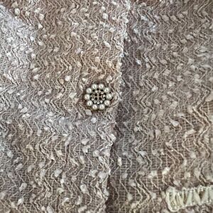 Girls pretty glittery beige tweed jacket and skirt set with beautiful faux pearl trims. Soft and mid-weight, this stylish jacket has a silky lining for added comfort. Ideal for a smarter occasion, it fastens with elegant pearl and diamanté buttons on the front.