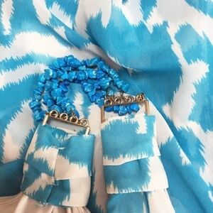 Features: Faux turquoise beaded strap with metal hardware, lined with a satiny fabric, pretty colours, sashed front, made in Canada