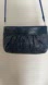Vintage Leather of the Sea bag is made from eel skin that has been crafted to have a snakeskin effect. It looks shiny. Gathered front detail. Very lightweight bag. Thin blue strap and blue smooth leather trim around outside of bag and along zipper on top. Interior is fabric lined with a zipper pocket. The strap detaches so that the bag can be used as a clutch.