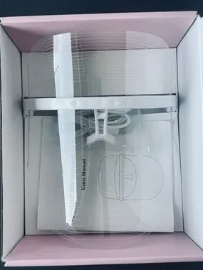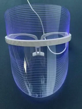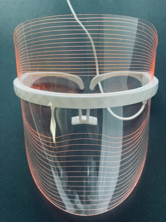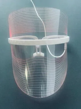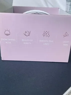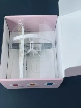LED Beauty Mask shown in box. White and clear color scheme. Simple illustrated packaging. Ideal for skincare lighting therapy.