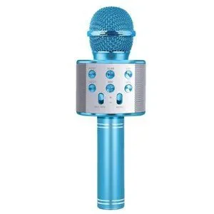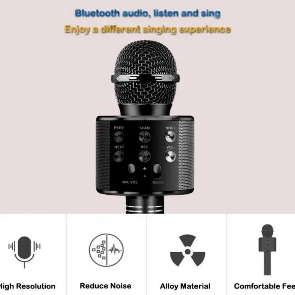 LED Microphone – A Wireless Microphone with HIFI Speaker with USB, TF Card, and Aux functionality. Controls Include a Microphone and Music Volume, Play and Pause, and a Record Function. Available in 4 Assorted Colors: Blue, Rose, Black, and Gold. Comes With 1 USB Type C Cord.