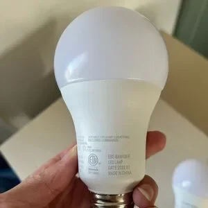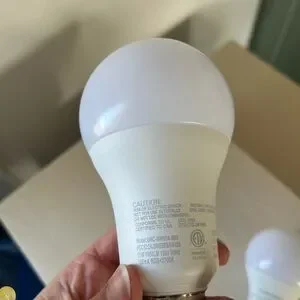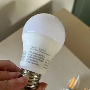 Lot of four LED bulbs. Two standard A19 white bulbs. Two clear candle bulbs with warm amber LED filaments. Energy-efficient lighting. Simple, modern style.
