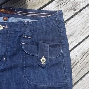 Really nice denim shorts by Lee One True Fit. Dress them up or dress them down, they are perfect no matter what your plans! Dark denim, cotton/polyester, zippered and button fly, 4 pockets, wide cuffs, pink decorative stitching. 17" waist lying flat, 10" inseam.