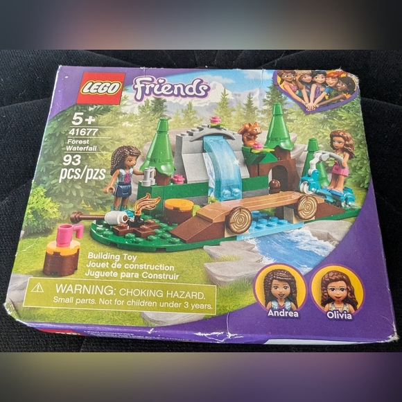 Comes with LEGO Friends Andrea and Olivia mini-dolls, a squirrel figure, a scooter, campfire, marshmallow on a stick, a bridge that crosses a river and a woodland waterfall.