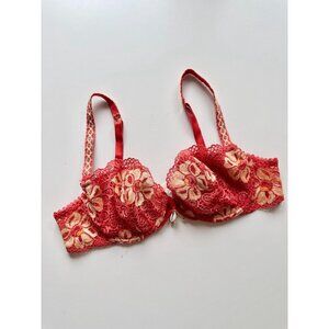 LEJABY Red Yellow Floral Lace Seashell Charm Demi Bra, Size 34C