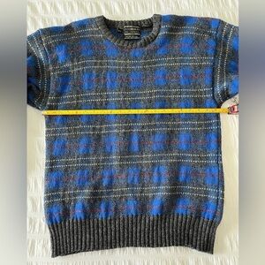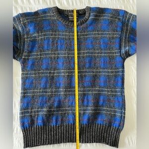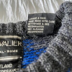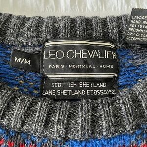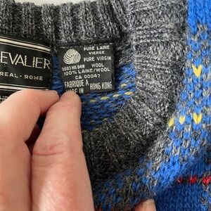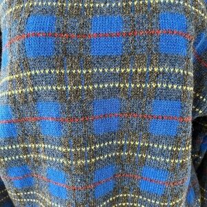 Leo Chevalier vintage sweater is made in Hong Kong of pure virgin wool. A predominantly grey and blue plaid pattern with yellow and red accents. Grey ribbed collar, cuffs and hem.
