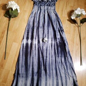 Beautiful off shoulder maxi dress in an ink blue tie dye. I know I say this every piece, but I wish this was my size. It's so cute. Features an elastic waist and top and is made from the softest 100% rayon. By the brand Leo meets Virgo. In love with this dress. Size small but again, would work on medium due to elastic. Dm to purchase. 🤍🖤