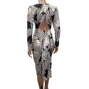 Turn heads in this striking black and white checkered floral midi dress! Featuring a bold geometric-meets-botanical print, this piece beautifully balances structure and femininity. The long sleeves and tailored fit create a sleek, sophisticated silhouette, while the unexpected open-back cutout adds a daring modern twist. The craftsmanship, detail and fit on this piece is absolutely incredible.