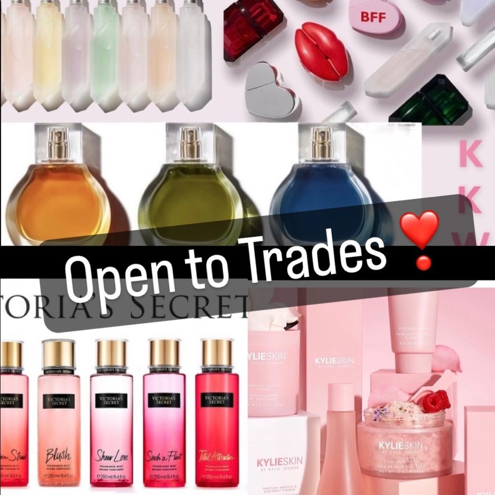 My personal favorites for trades are KKW Fragrance/KKW Beauty, KYLIE skin/cosmetics, Victoria’s Secret Fragrances/Body Mists, FENTY Beauty, SKIMS (size X-small, small or medium), MAC cosmetics, DIOR makeup, CHANEL makeup, Fragrances, & more!!