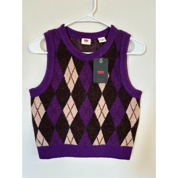 LEVIS Deja Vu Sweater Vest Womens Size XS Purple Brown Argyle Super Cozy Plush