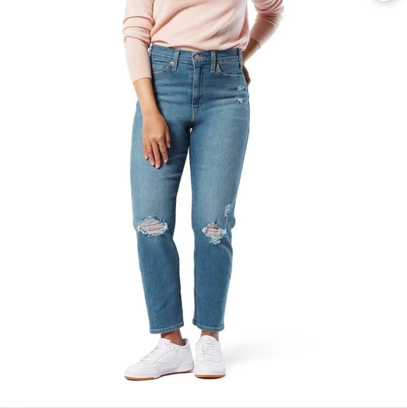 High-rise women’s jeans in a light blue wash with tasteful knee distressing. The straight leg silhouette offers a comfortable, modern fit. Durable denim designed for everyday wear with clean, classic styling. Pair these light blue jeans with sneakers or boots for versatile looks.