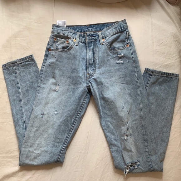 These are super cute mid rise, straight cut, light wash Levi’s jeans.