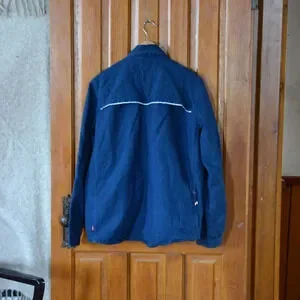 Navy blue with reflective stripe across the back. It is lightweight with a lining of sorts and LOTS of pockets!
