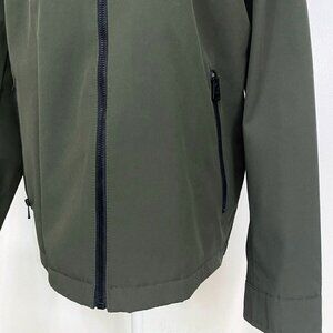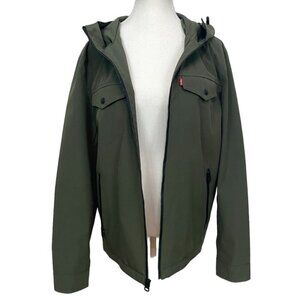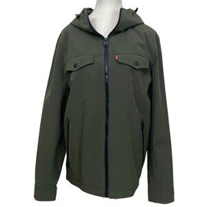 LEVI'S MEN'S OLIVE GREEN WATERPROOF ARCTIC CLOTH RAINCOAT, Levi's Mens Artic Cloth Filled Performance Rain Shell Jacket, Rain jacket in water resistant arctic cloth material with adjustable drawstring hood - Two chest flap pockets with snaps, two lower welt zipper pockets and one interior welt pocket - front zipper closure - Adjustable snaps at cuffs for added comfort - Levi's Olympic logo patch on left chest and Levi's red tab on lower left side seam. Perfect modern athleisure transitory seasons fall and spring favorite jacket.