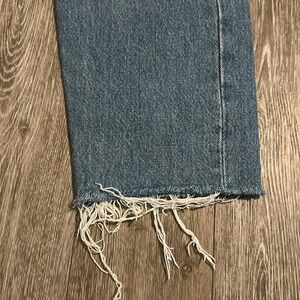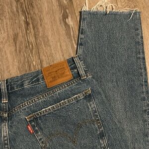 Stylish blue denim jeans featuring a trendy frayed hem. Perfect for casual wear. LEVIS Premium WEDGIE High Rise Straight Distressed Big E Jeans Womens Size 32. Inseam at 24”. Distressed fray at the bottom hem otherwise in excellent condition, no rips tears holes or stains. Shipped Purolator.