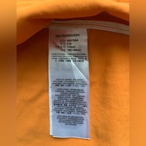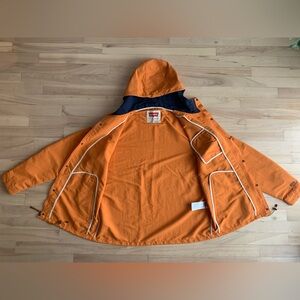 Bright orange raincoat with a hood. Features button closure and drawstring hem. Ideal for rainy days.