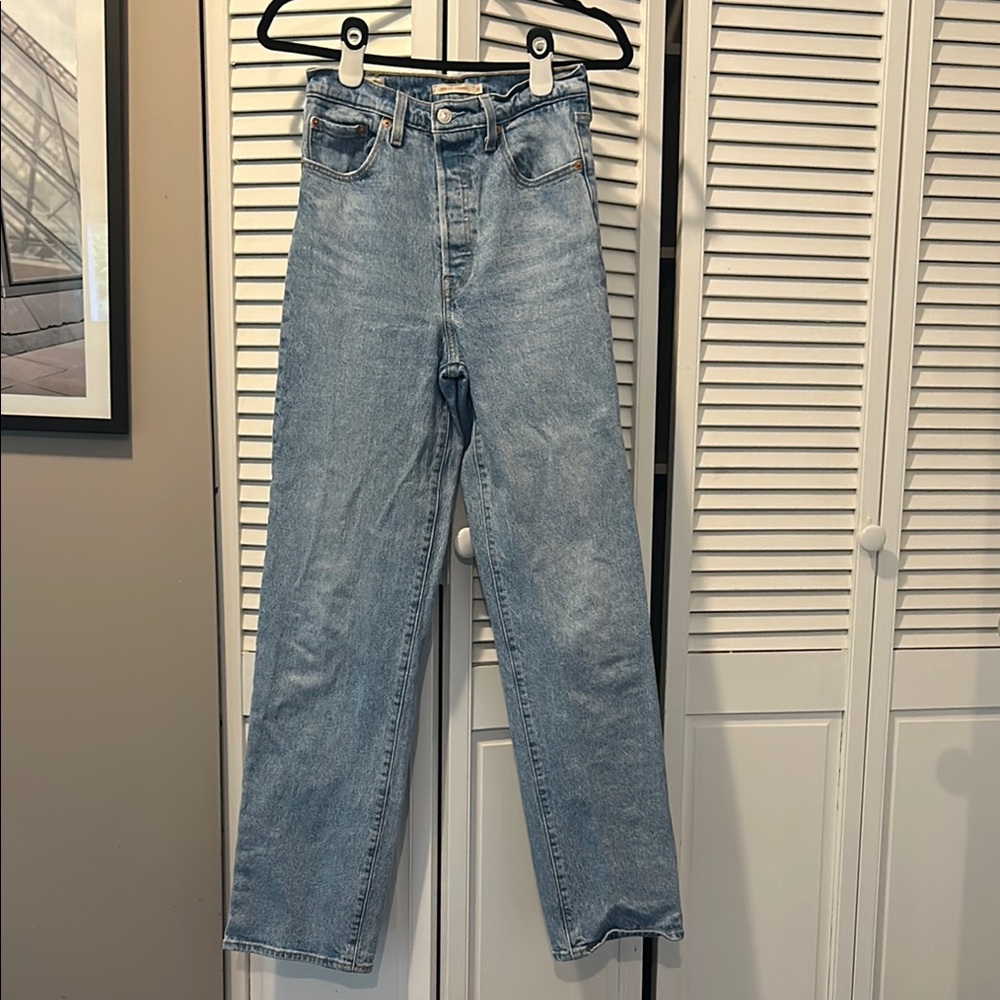 High rise fit. Light blue denim. Size W26 L32