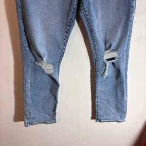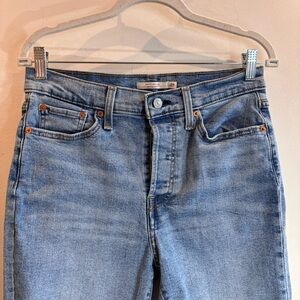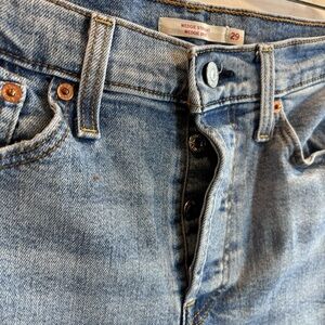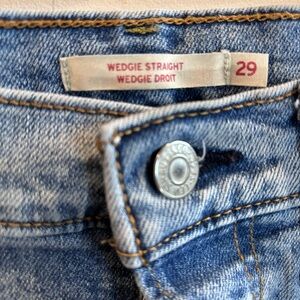 LEVI’S Sz 29 Wedgie Straight Light Wash Distressed Button Fly Jeans. Waist: 15.5” Rise: 11.5” Inseam: 28”