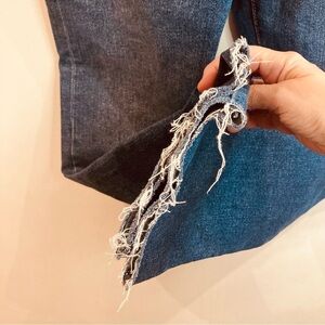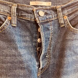 LEVI’S Sz 31 Wedgie Straight Mid-Wash Torn Knee Button Fly Raw Hem Ankle Length Jeans. No fabric tag. Has a little stretch.